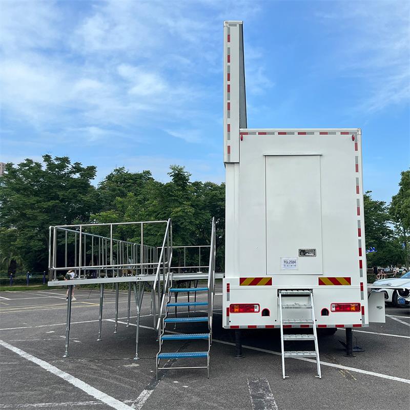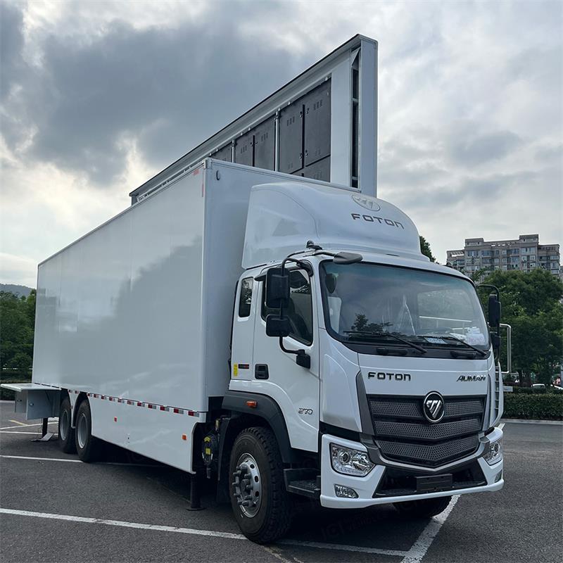 This EBL9600 Mobile led truck is a promotional tool that integrates the LED screen, audio equipment, display space and mobile platform. Its appearance design is fashionable and unique, which can attract people's attention. The size of the carriage is 11335 * 2350 * 3720mm, equipped with 8000 * 2000mm HD outdoor display, LED screen can lift, hydraulic remote control operation, lift stroke up to 2000mm. At the same time, in order to facilitate all kinds of performance tour, the truck is installed (8000mm + 2000mm) * 3000mm large double folding hydraulic stage, which can achieve various types of display and publicity.