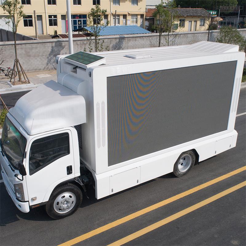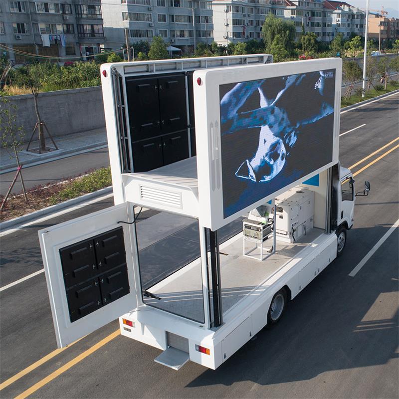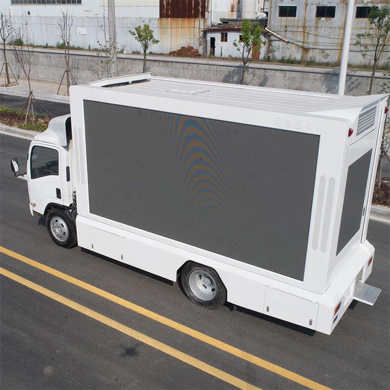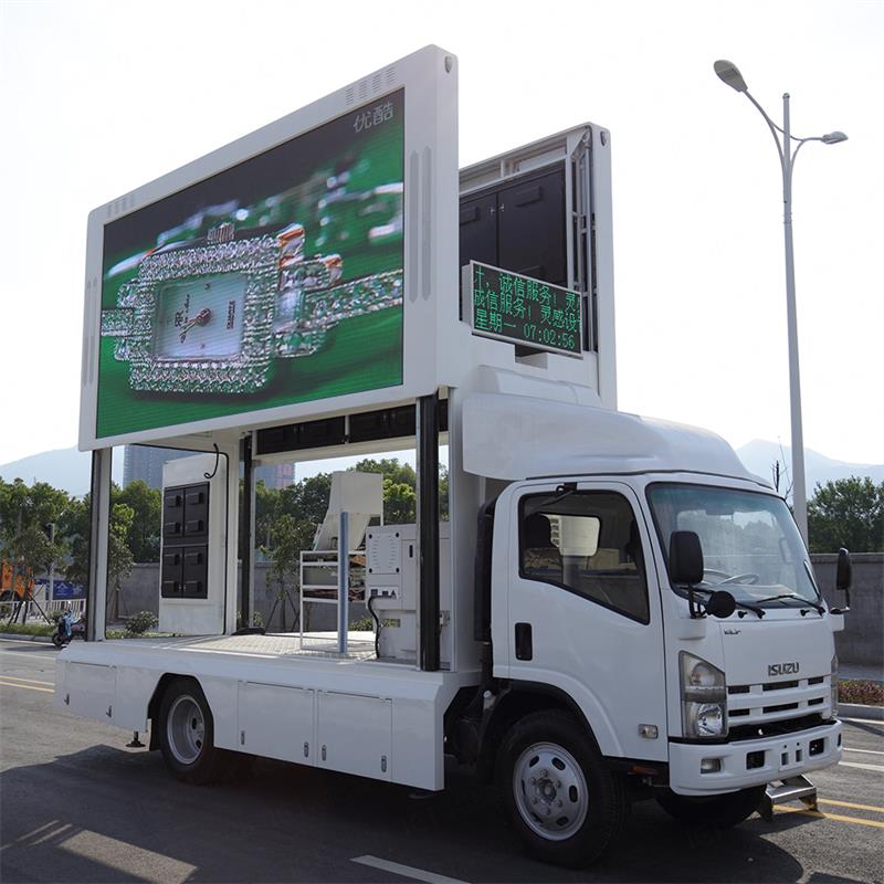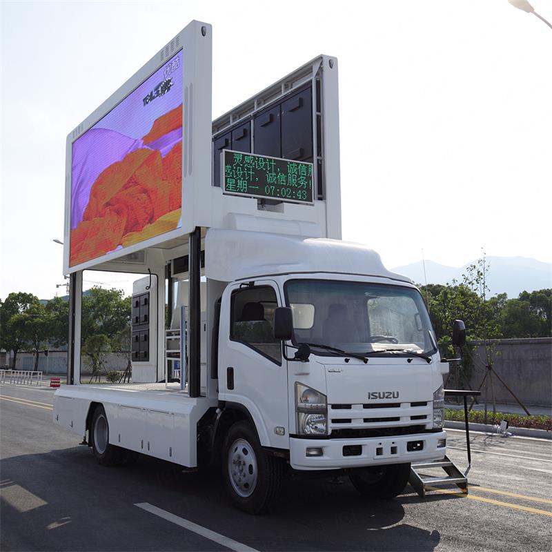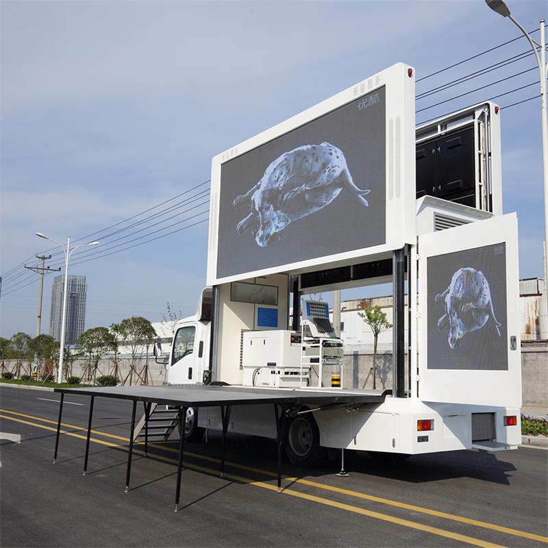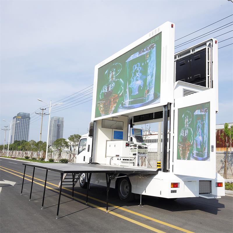 EW3815 LED advertising car selected from Chinese well-known brand-Foton Isuzu chassis as the mobile carrier, the left and right sides of the vehicle are equipped with a size of 4480mm * 2240mm outdoor LED display, the rear of the car is installed with 1280mm * 1600mm full color display, the appearance design is high-end, atmosphere, beautiful, screen playing effect is perfect. EW3815 LED advertising car is equipped with two power supply modes: one is the power for the external power supply; the other is equipped with a 24KW silent generator in the compartment, in the case of no external power supply, can use the own generator power supply, 24KW super power, fully meet the outdoor power supply demand. Not only that, the EW3815 type LED AD car has more propaganda function, the left and right sides of the LED screen can lift up and down, lift trip 2000mm, also configure the hydraulic operation stage, only need to gently press a few buttons, when the car on both sides of the screen rise up, a 5000mm * 3000mm hydraulic stage slowly, only 10 minutes, a LED AD car can change into a multi-functional stage display car, customers can use LED AD equipment held new launch, small concert and other kinds of activities.