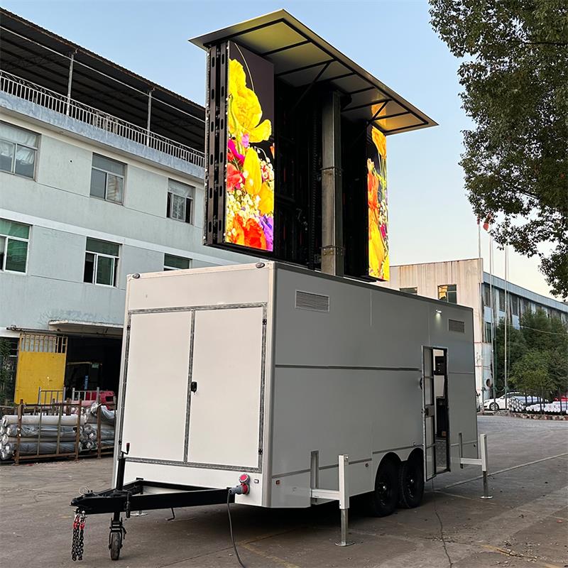 | Maximum trailer weight :3500kg; Trailer width:2.4m; Maximum Screen height (top):7.8m; Galvanized chassis made according to DIN EN 13814 and DIN EN 13782; Anti slip and waterproof floor; Hydraulic, galvanized and powder coated telescopic mast with automatic mechanical safety locks ; Hydraulic pump with manual control (knobs) to lift LED screen up:3 phase; 360°screen manual rotation with mechanical lock; Auxilary emergency manual control - handpump - screen folding without power according to DIN EN 13814; 4 x manually adjustable sliding outriggers:For very large screens it may be necessary to put out the outriggers for transport (you can take it to the car pulling the trailer). |
