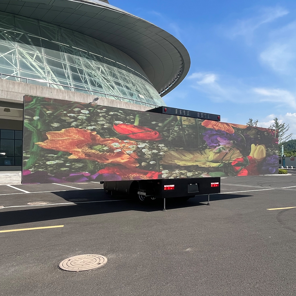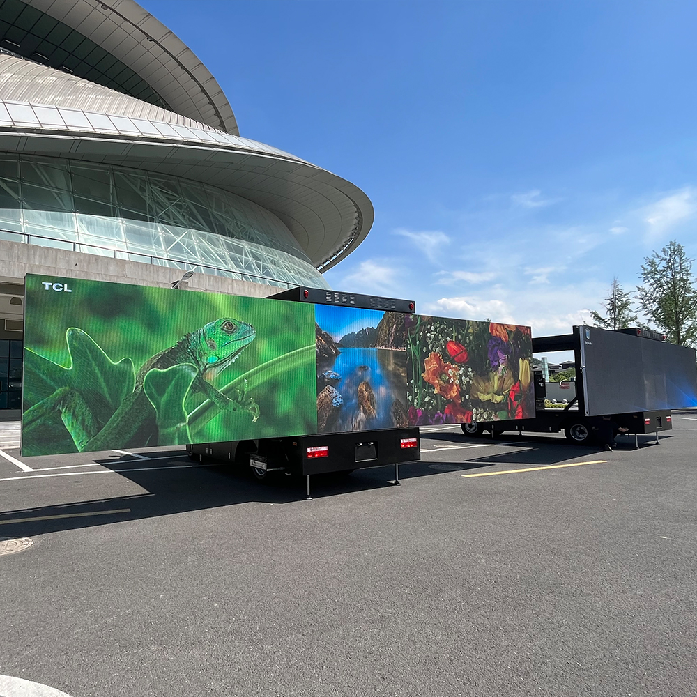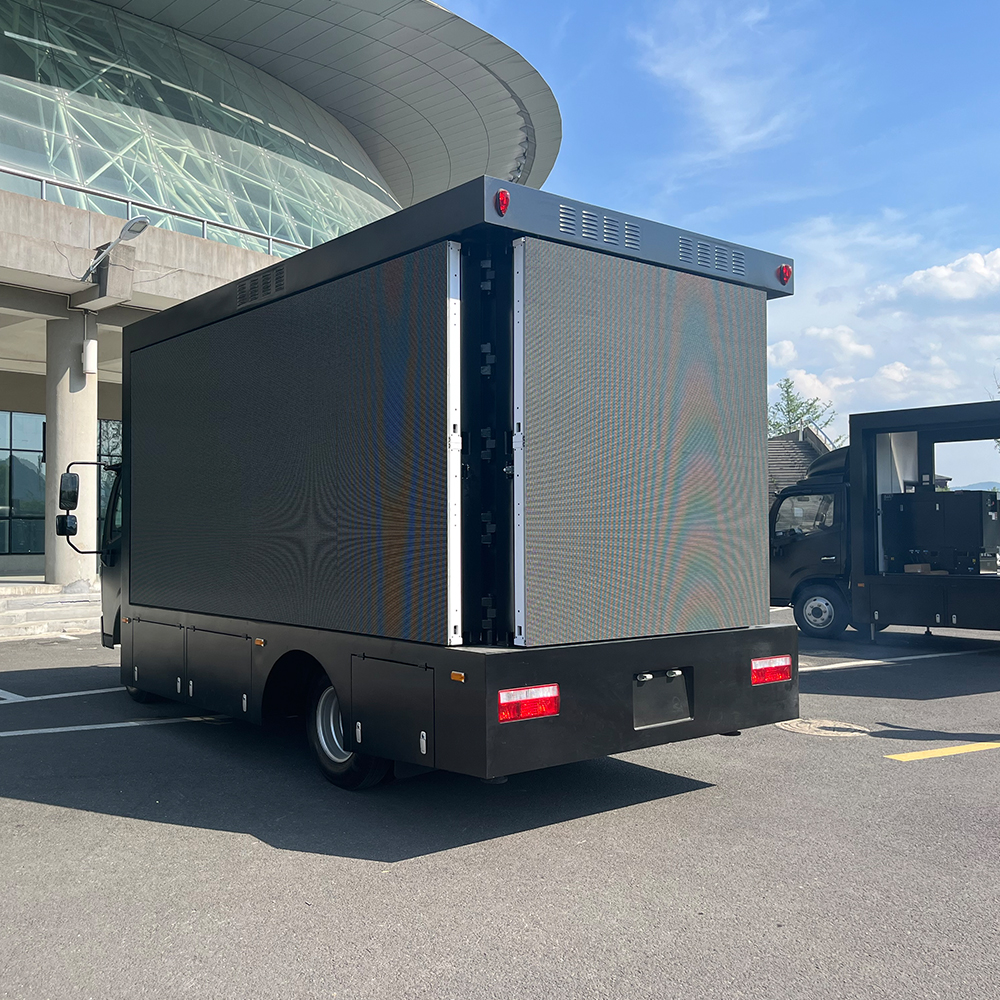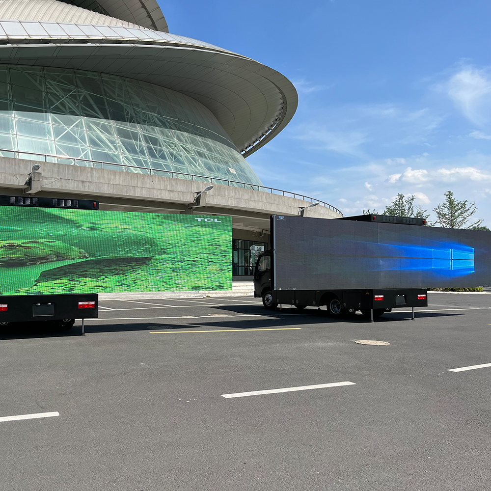 The 1920mm*1920mm screens on both sides of the advertising car can be unfolded sideways, and spliced with the 1920mm*1920mm tail screen of the carriage to form a whole 9600mm*1920mm large screen. The seamless splicing process eliminates visual gap interference, and the screen display is complete and coherent; The system, the three-sided screen can not only play the same content audio synchronously, but also play different content audio in split screen, the performance is reliable, and the playback content can be switched at will, you can do as you like.