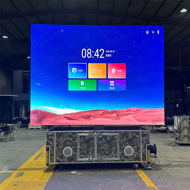 The screen is divided into upper and lower parts, Can be folded for storage, Easy to carry and transport; Functional structure design on the procurement of hydraulic lifting and manual rotation combined, When the main screen is raised to a predetermined height, Then manually rotate 180 degrees combined with another screen, Then drop the lock screen, Lock the two screens firmly together, Simplify the operation and improve the equipment safety; After the screen lock, The side screens on both sides begin to synchronize outward, Until fully deployed to form a size of 3600mm * 2700mm, A complete large screen of nearly 10 square meters, This size makes the PFC-10M portable folding LED screen suitable for a variety of major events, conferences or exhibitions, Provide enough display space to display all kinds of content.